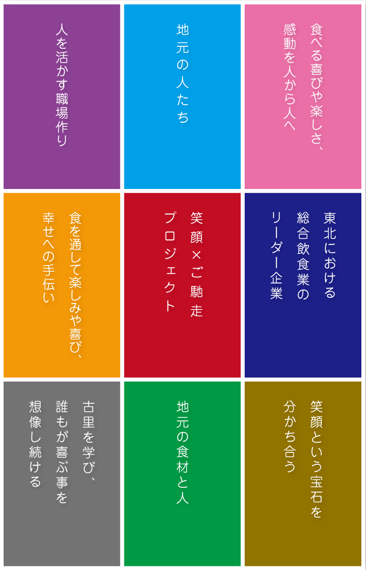 人や物、歴史も地産(ふるさとで産まれ)地生(ふるさとで生きる)を信条にふるさとの山形を誇りに想い、これからも食を通じて貢献し続けていきます。